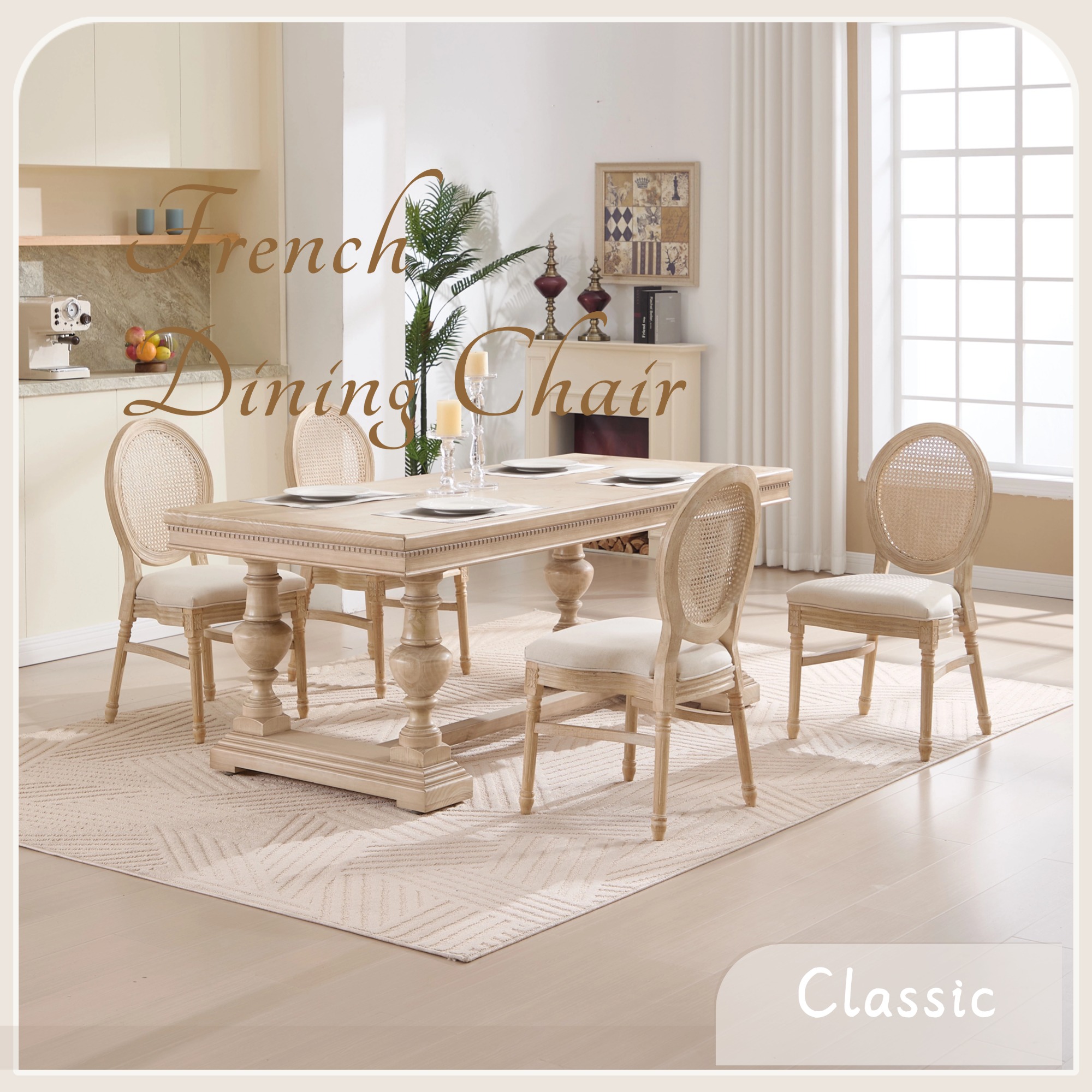 Product Name:French Country Dining Chairs Set of 2, Upholstered Chairs with Nature Rattan Round Back, Wire drawing and carving techniques ,Disassemblable and Stackable, for Living Room, Kitchen , Restaurant Use