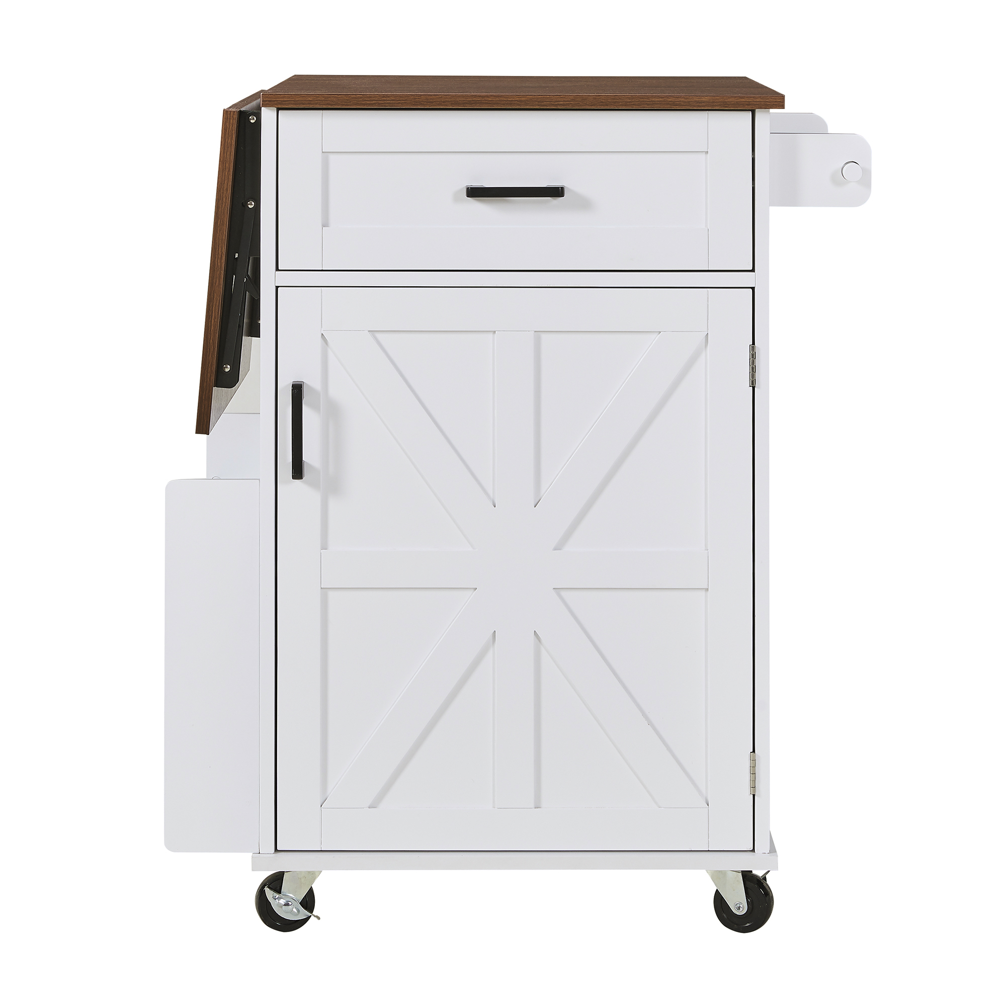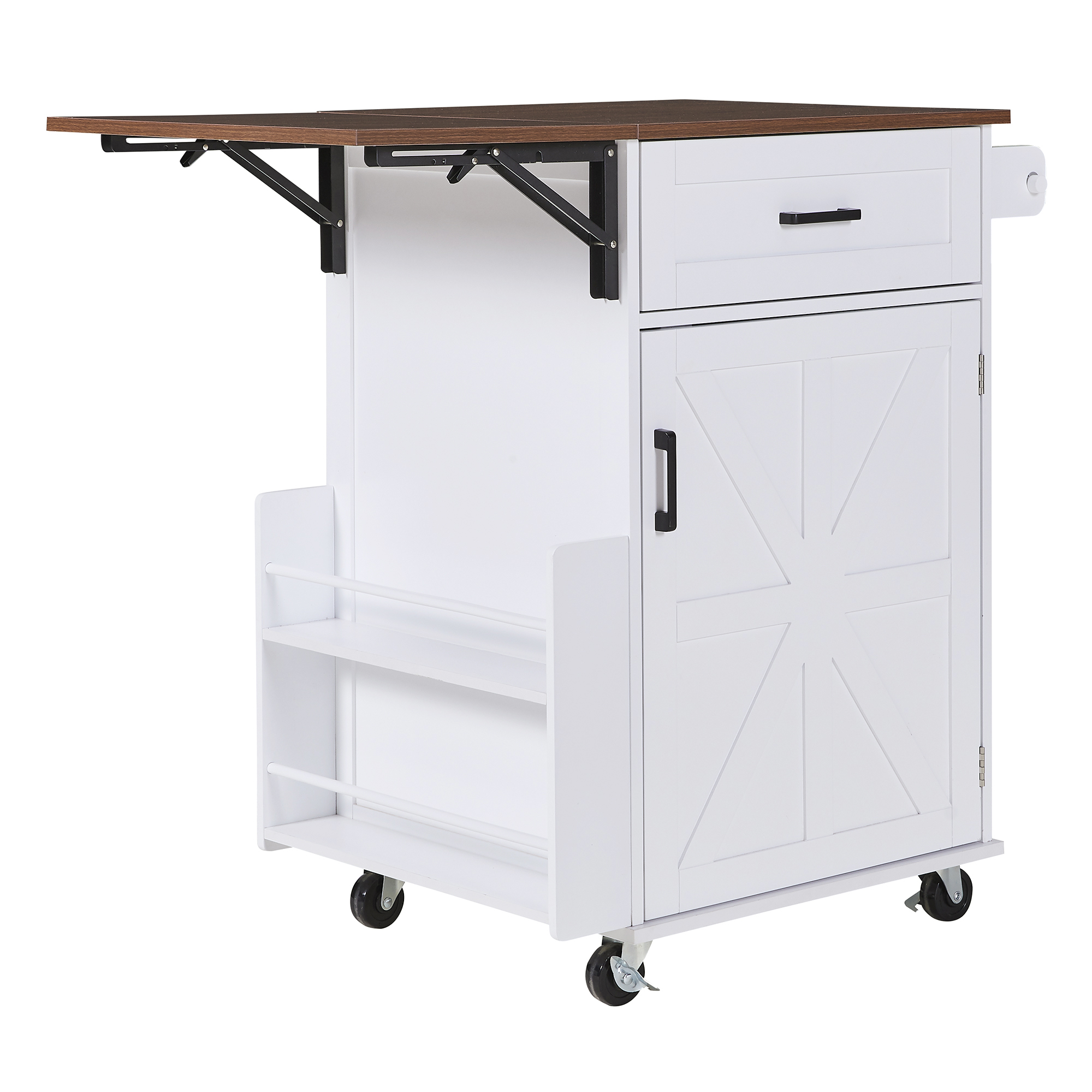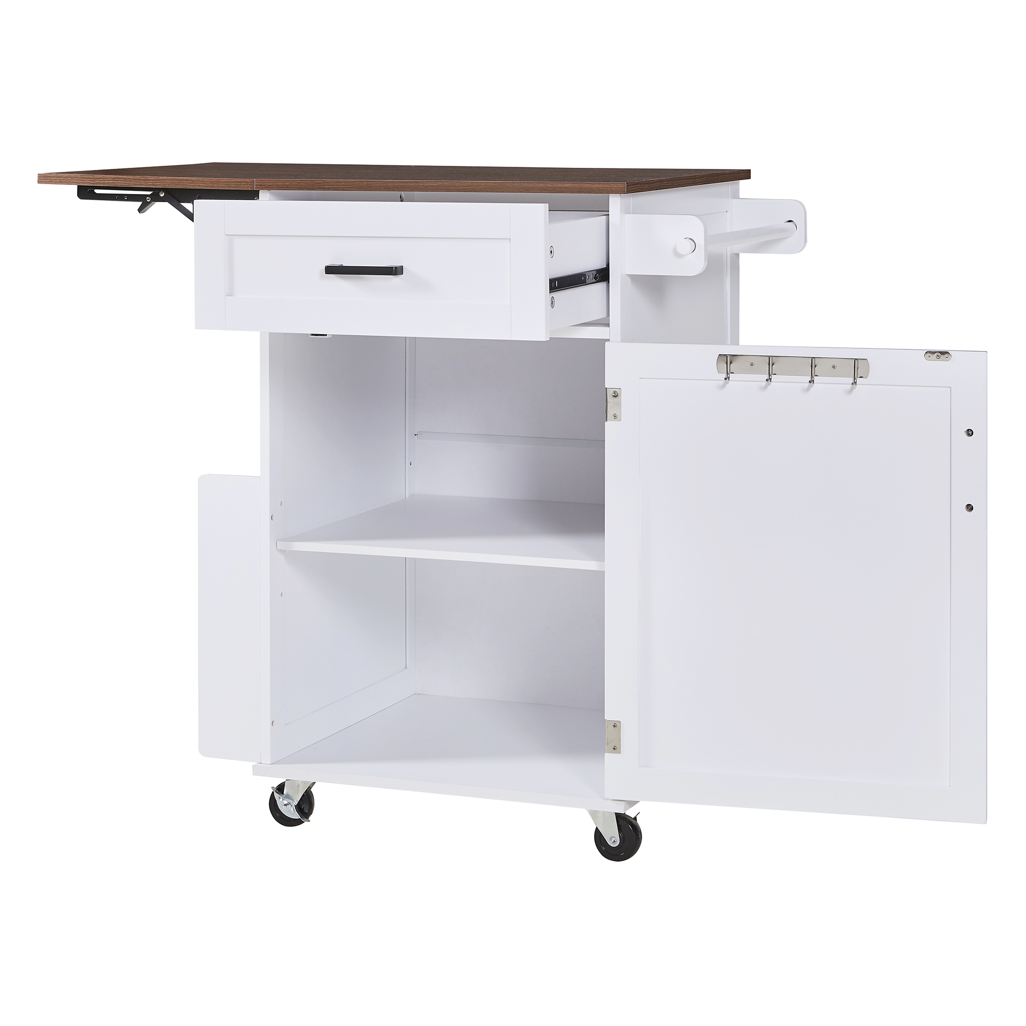 Product Name:K&K 39.3" Farmhouse Kitchen Island with Drop Leaf, Kitchen Storage Island with Open Side Rack, One Drawer, Towel Rack, Rolling Kitchen Cart with Lockable Wheels for Lawn Garden, White