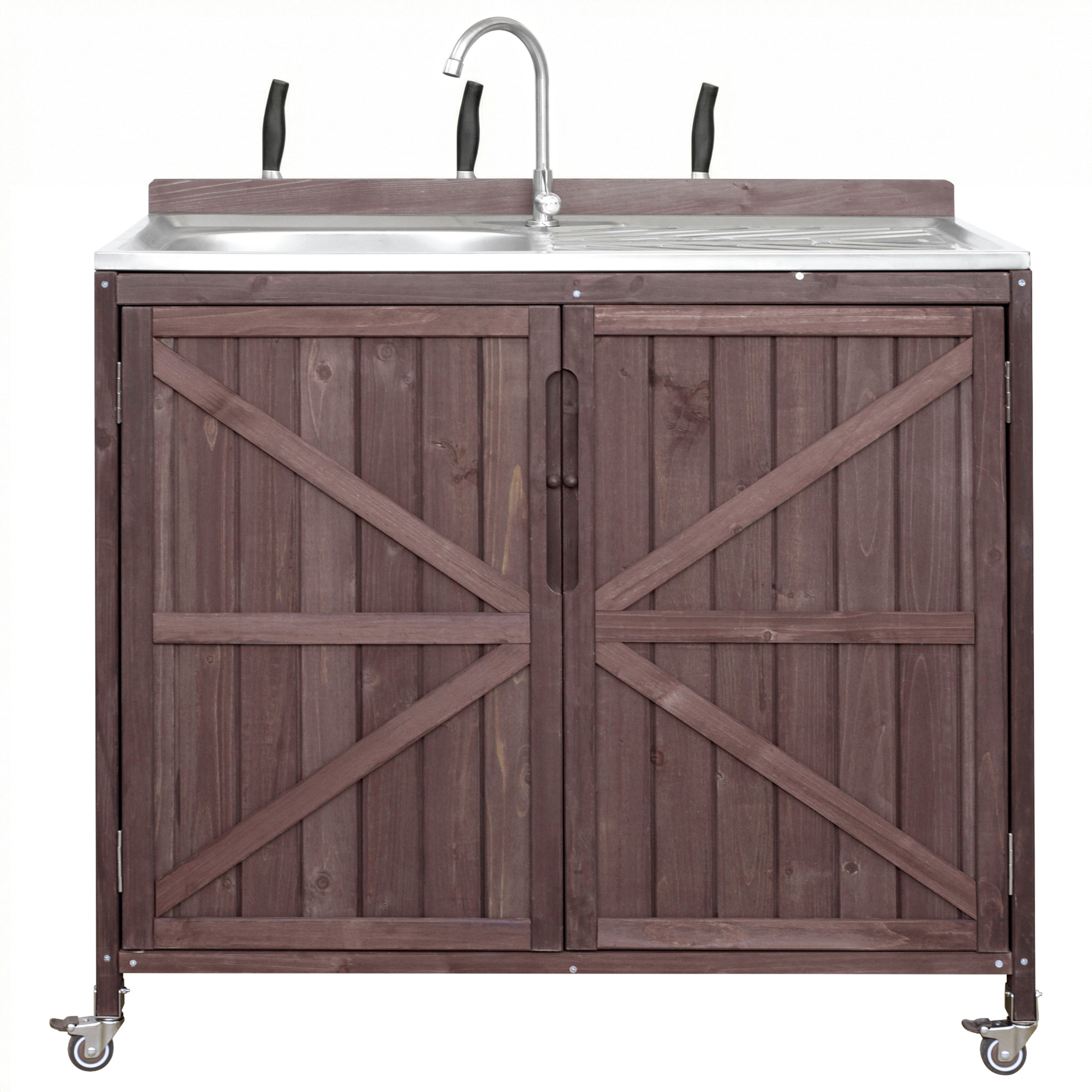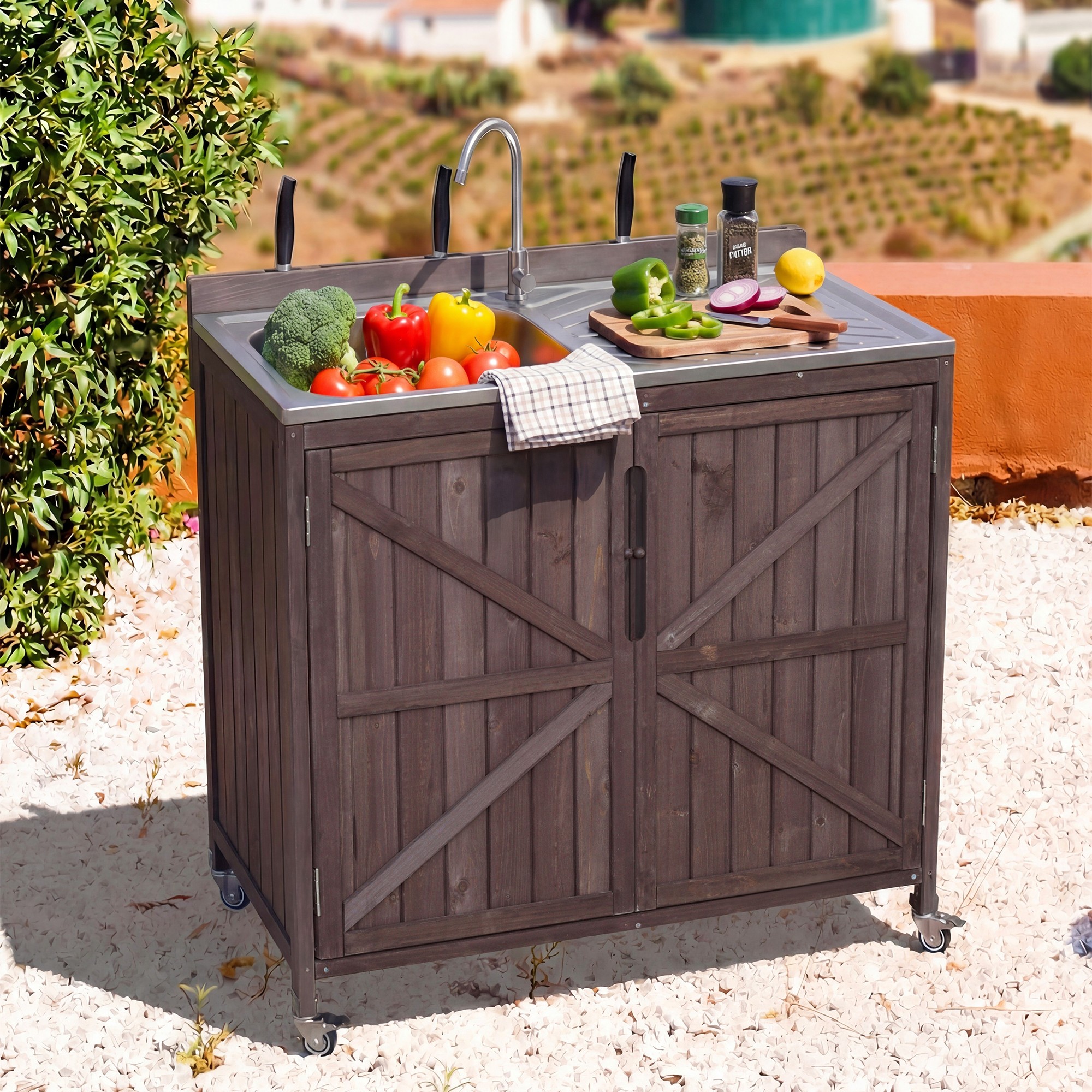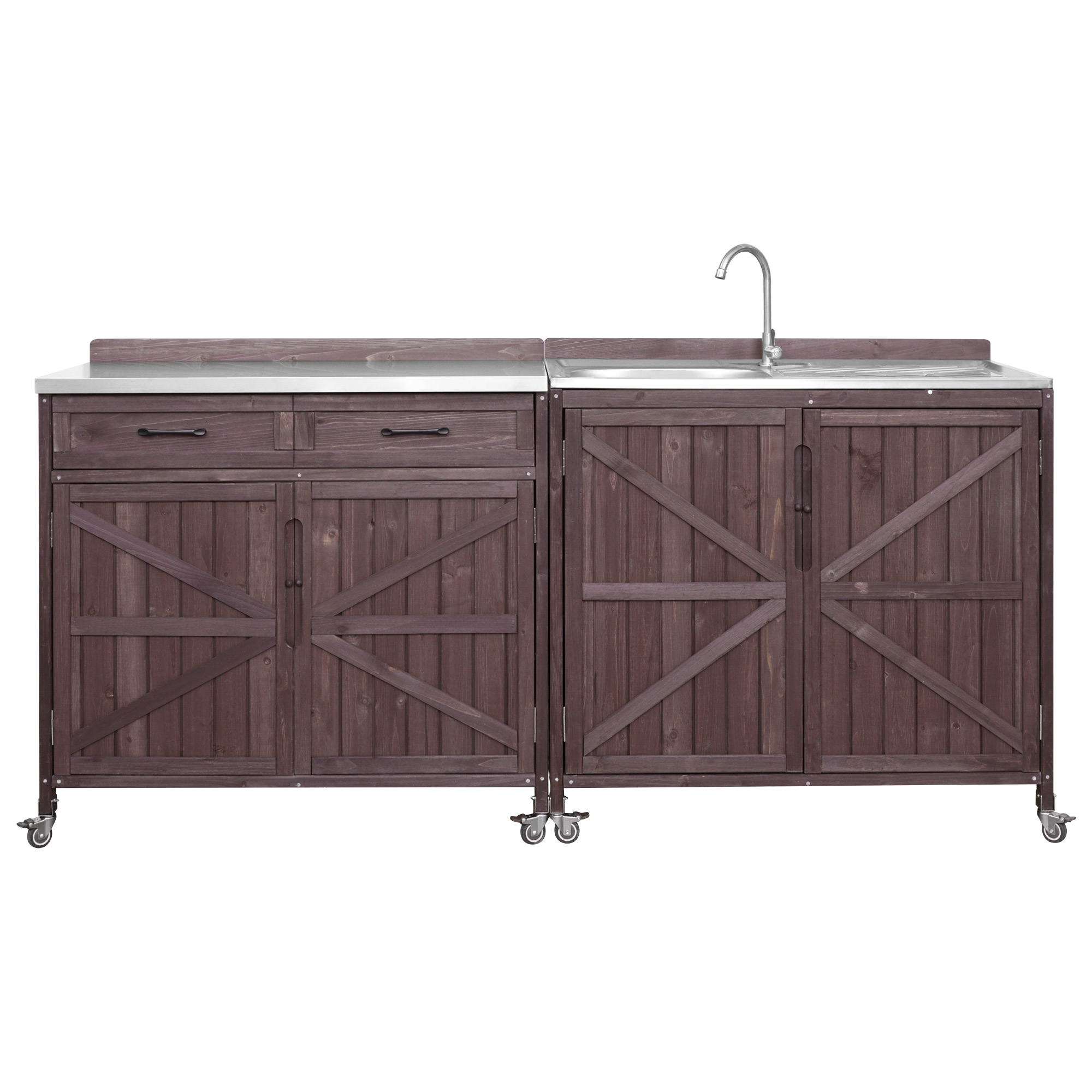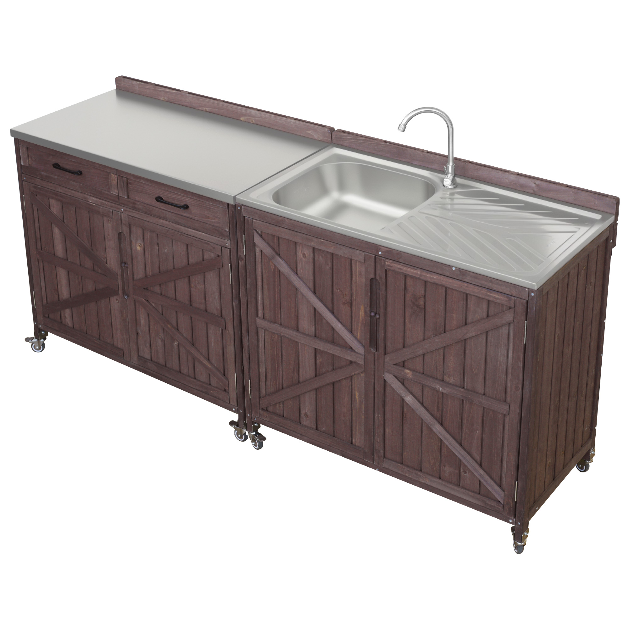 - [Heavy Duty Structure] Crafted from 100% exquisite fir wood, this outdoor bar cart exudes natural charm while prioritizing skin-friendliness and minimal chemical coatings. The table of outdoor kitchen sink station, constructed from a 304 stainless steel table with a single bowl sink, offers an easy-to-clean and durable spacious grill table for preparing food ready for cooking. Exclusively designed for your house, we guarantee a long-lasting and sturdy product.