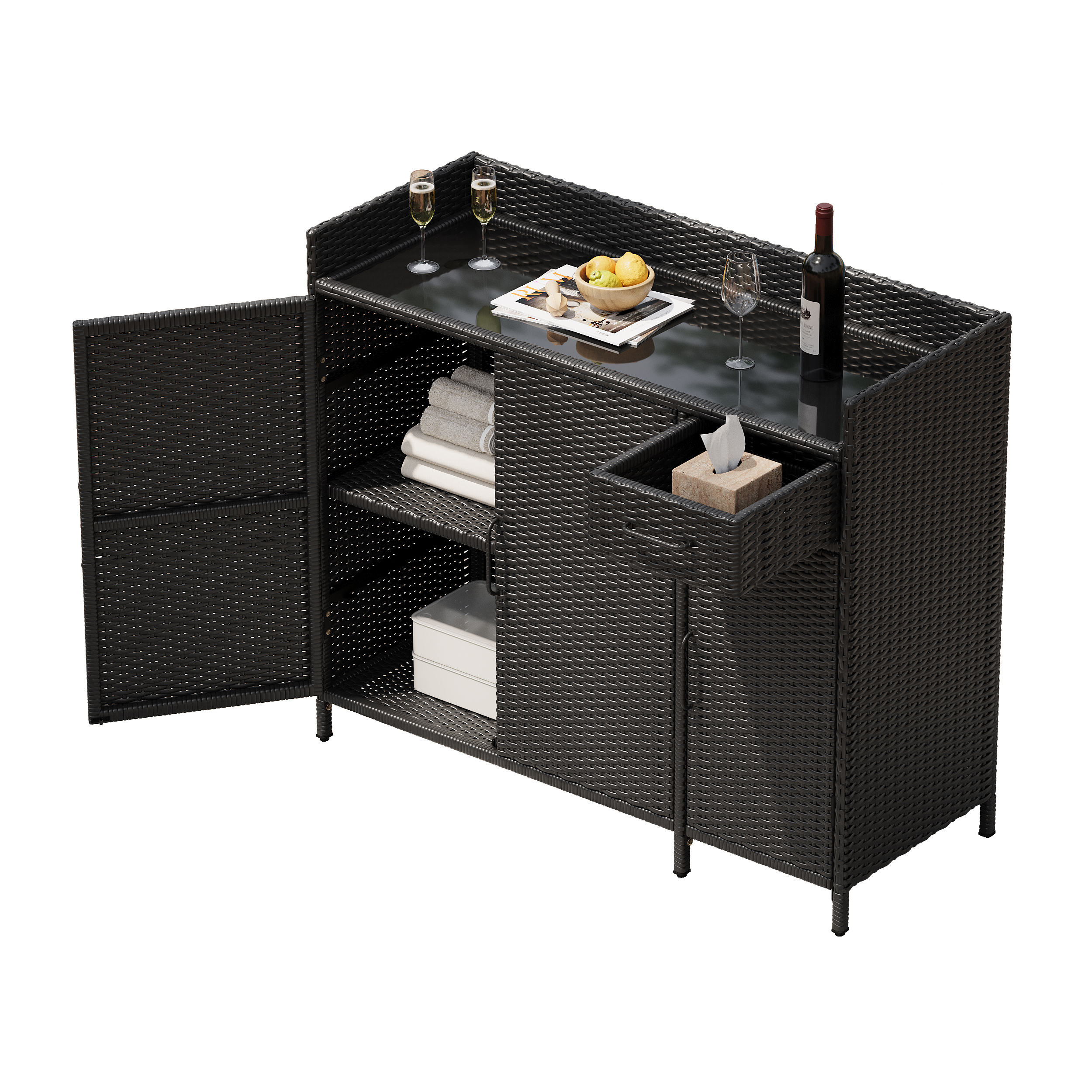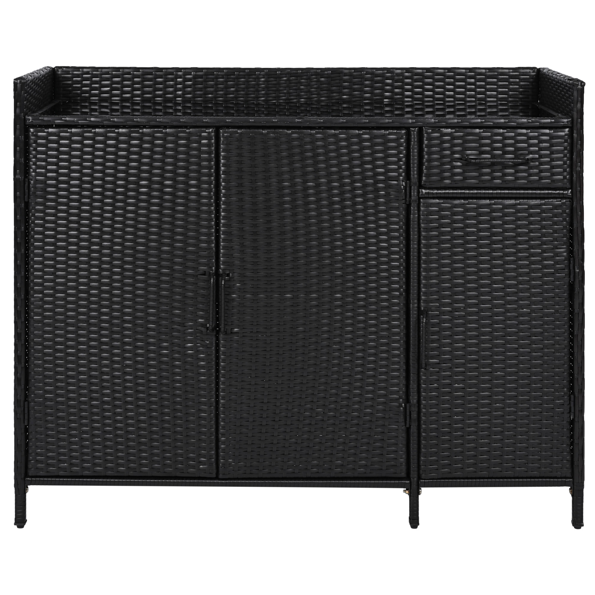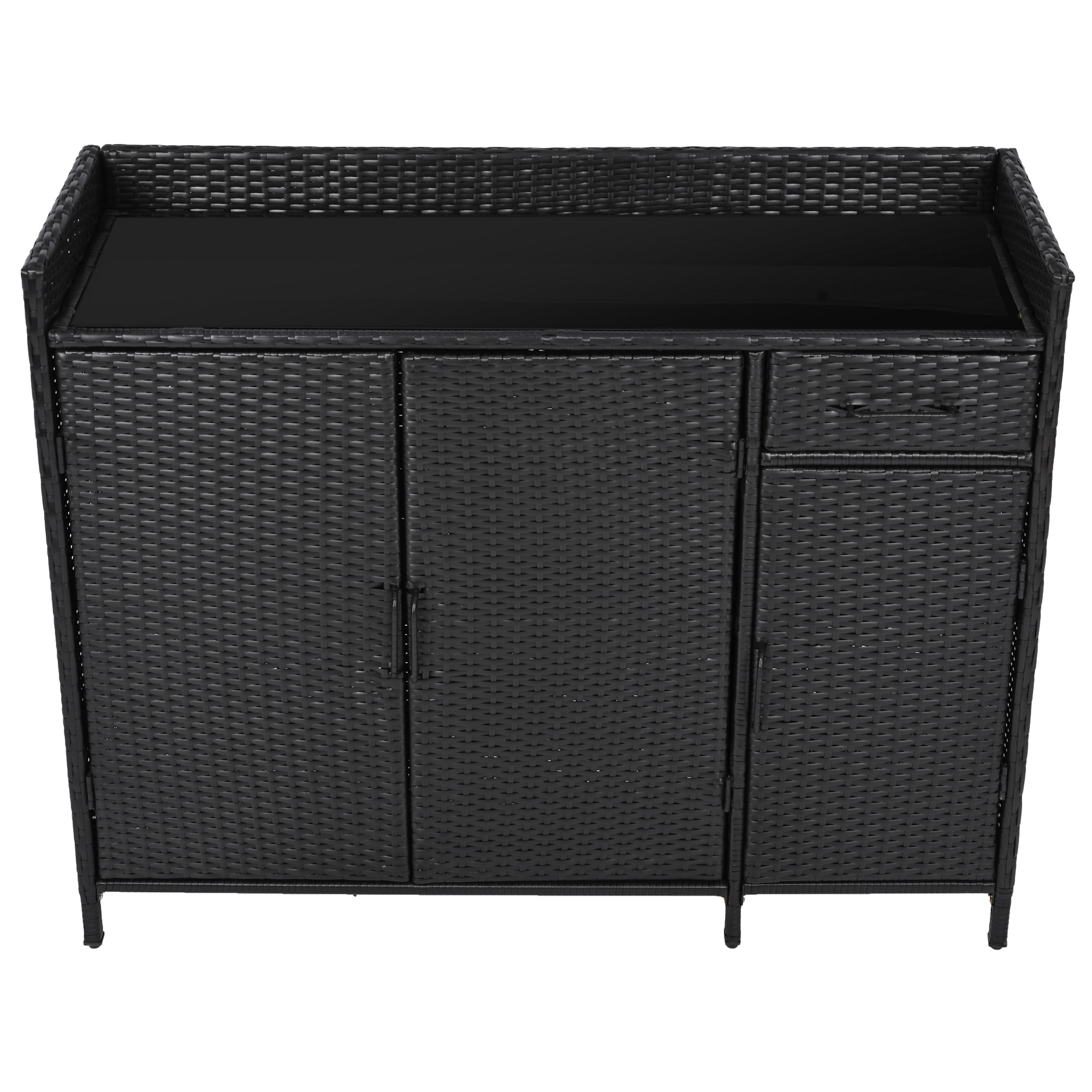 K&K 47.5 W Wicker Outdoor Storage Cabinet With Tempered Glass Desktop, Weather Proof Rattan Bar Table With Three Doors, Adjustable Shelf, And One