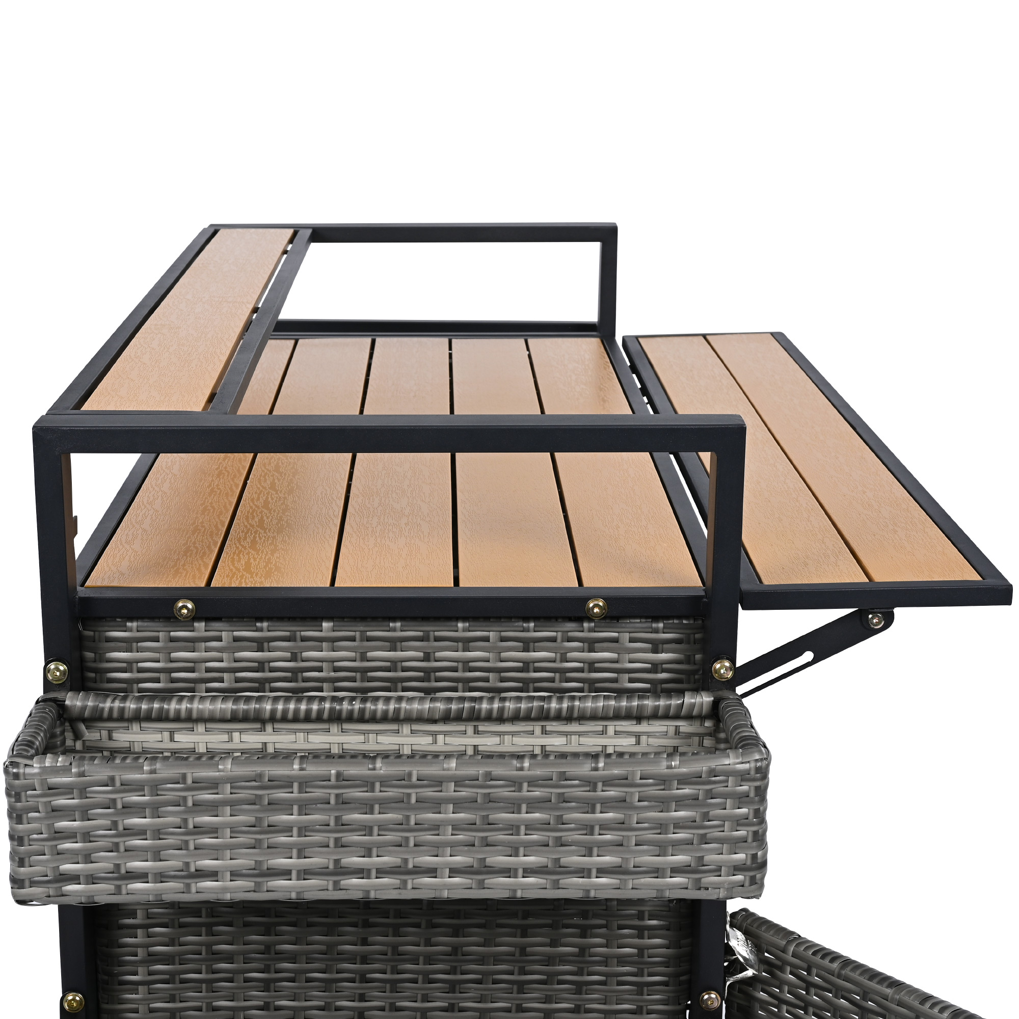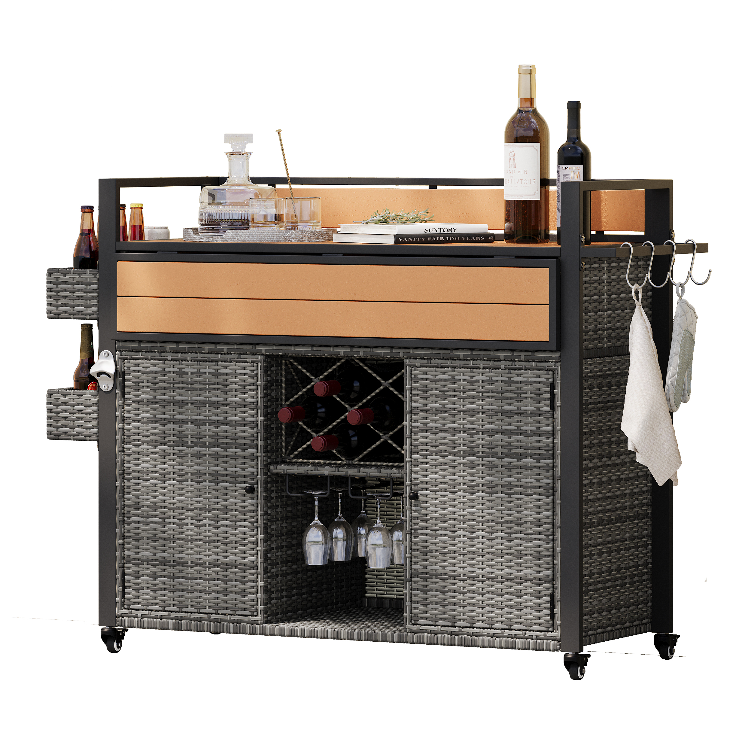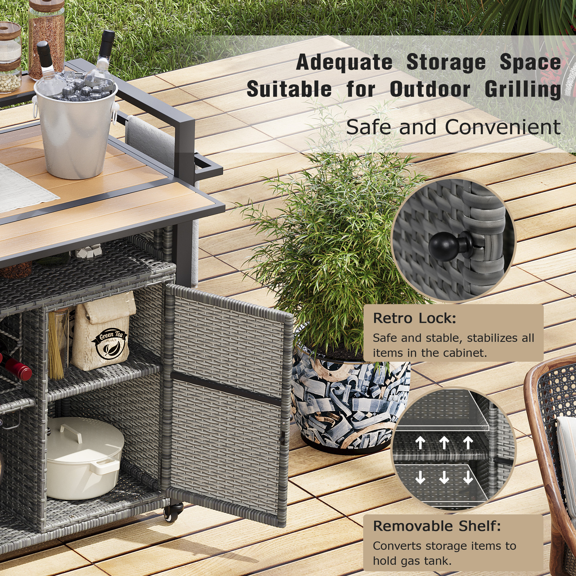• [Durable Material] This is a grill cart for outdoor environments. The exterior rattan structure can meet your outdoor needs to a great extent. The overall support structure is a sturdy steel frame for stability and safety. The outer layer is covered with weather-resistant wicker rattan. All table tops are made of poly-wood. It can withstand different kinds of weather and last for a long time.