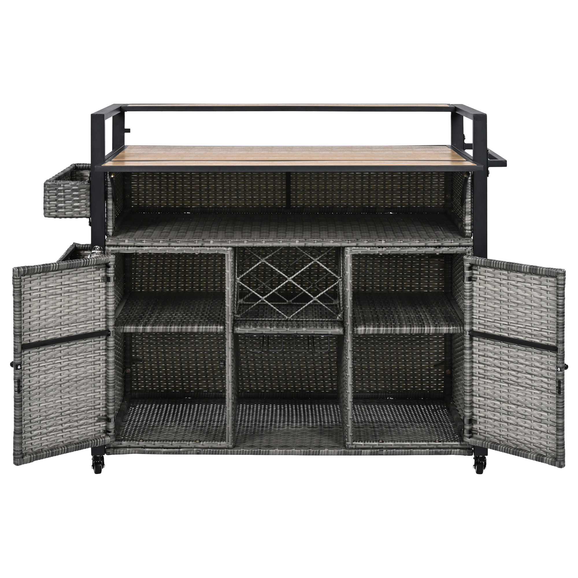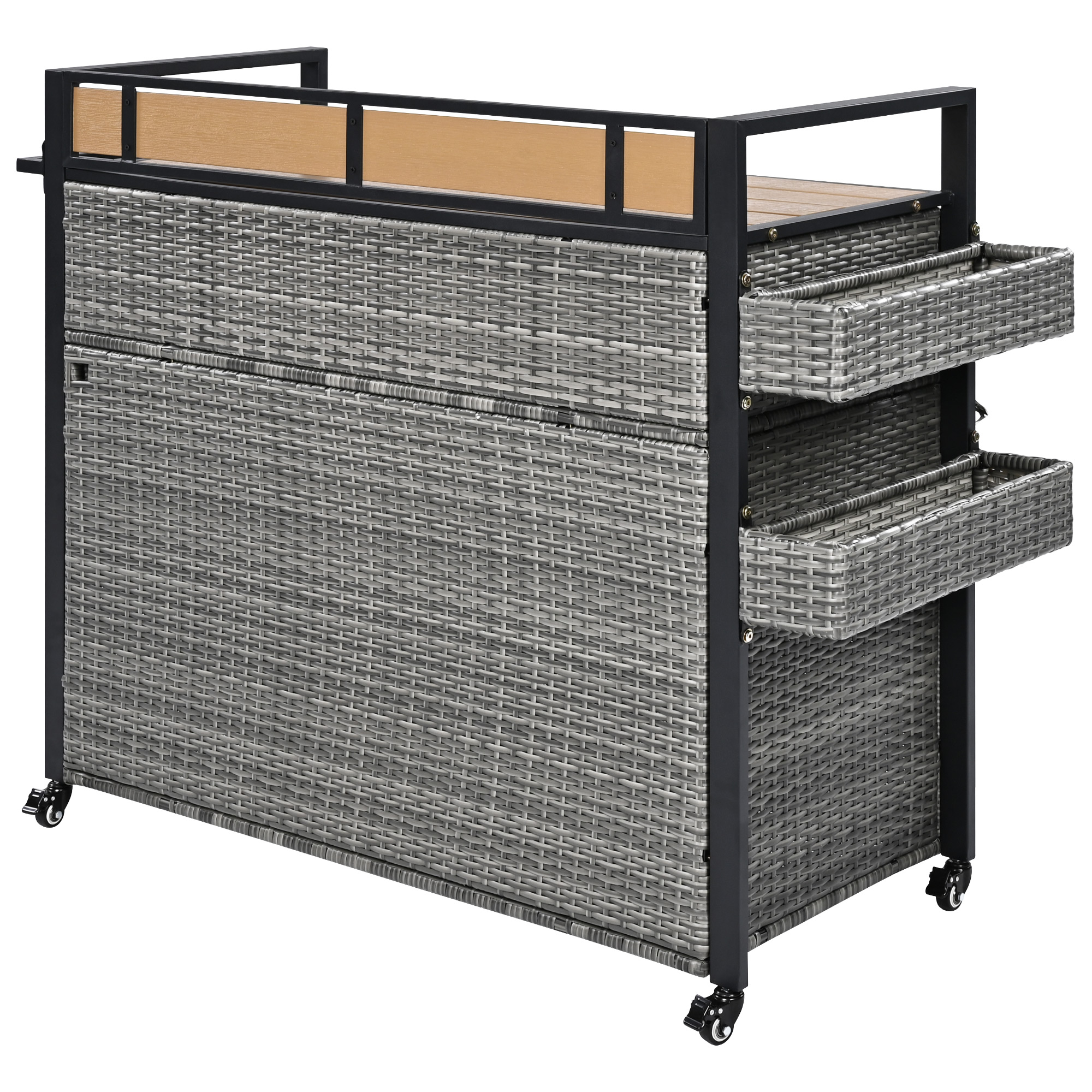 K&K 52.8 W Wicker Outdoor Grill Cart With Extended Plastic Wood Table Top, Rolling Kitchen Island On Wheels With Storage Cabinet, For Patio Backy