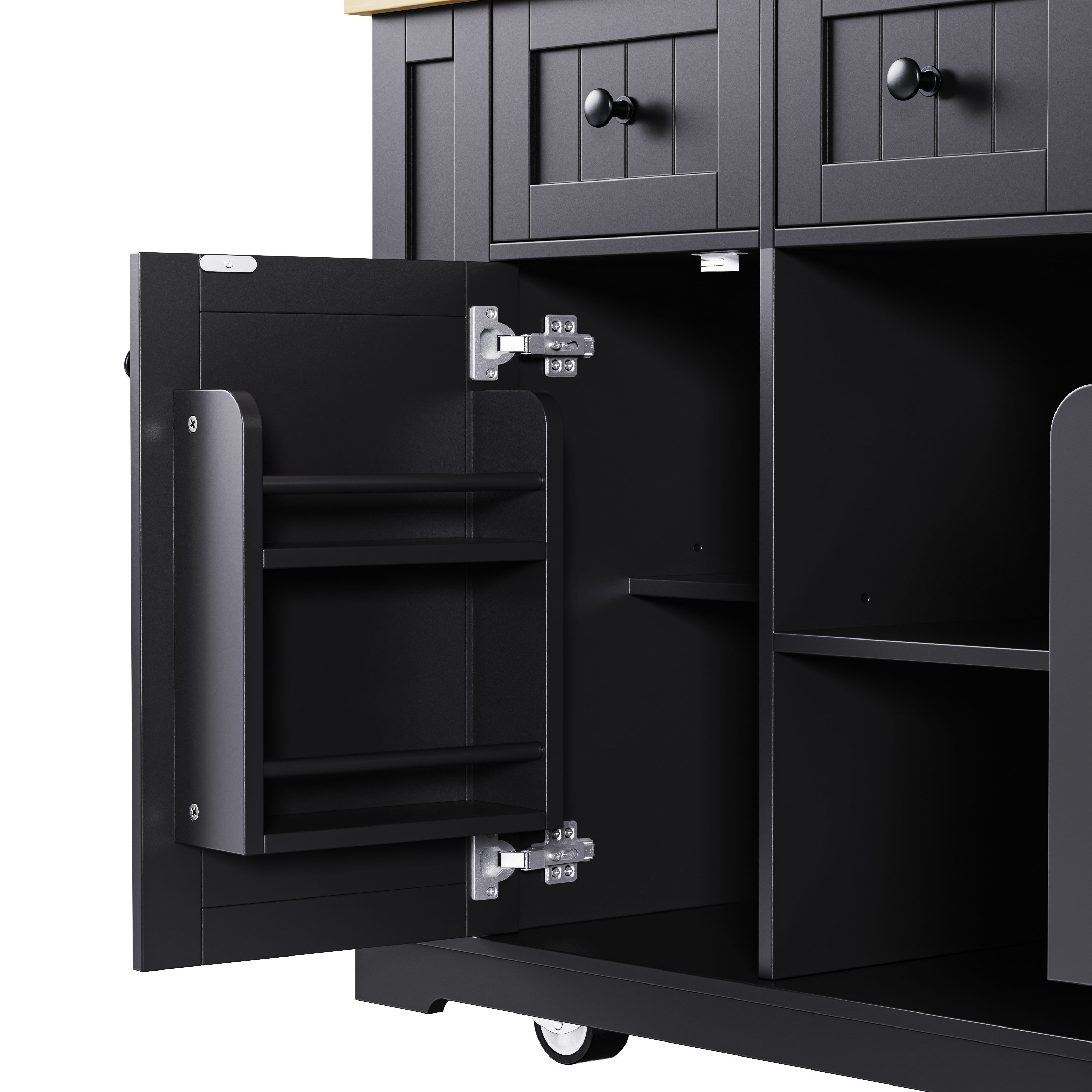 • [Internal Storage Racks] Our rolling kitchen island is designed with an internal storage rack inspired by the functionality of refrigerator doors. The two barn doors all feature 2-tier shelf racks, providing easy access to soy sauce, barbecue sauce, and other condiments, and sticks that can keep things from falling. This design effectively optimizes storage capacity while occupying minimal space, making it an ideal addition to kitchens, dormitories, offices, bedrooms, and dining areas.