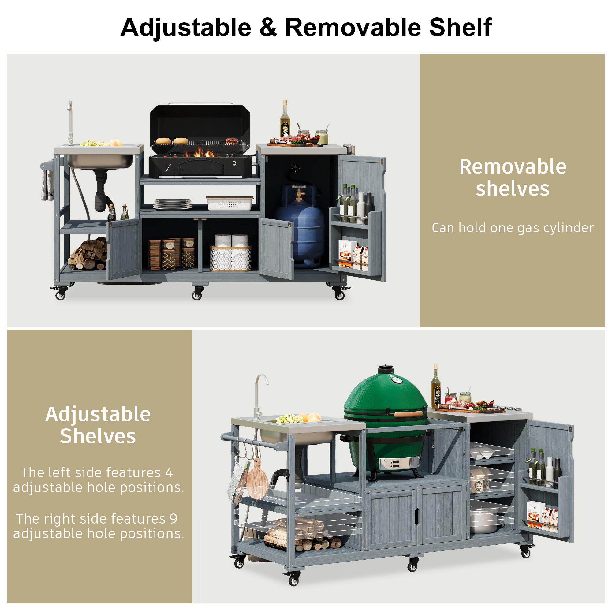 • [Ample Storage Space] This outdoor cart doubles perfectly as an outdoor storage cabinet. The oversized right cabinet features multiple adjustable shelves, accommodating items of all sizes and types. The door rack holds bottles and jars, while the dual-door cabinet in the center stores all your outdoor gear. To mount a gas grill on the cabinet top and store the gas tank inside, simply remove the shelves from the right cabinet and safely route the gas line through the vent hole for optimal layout.