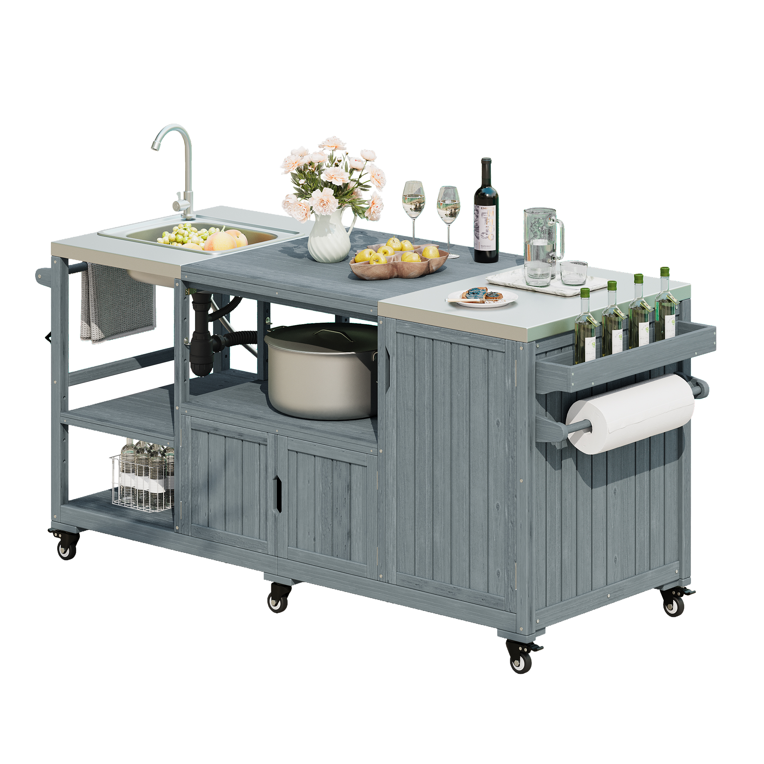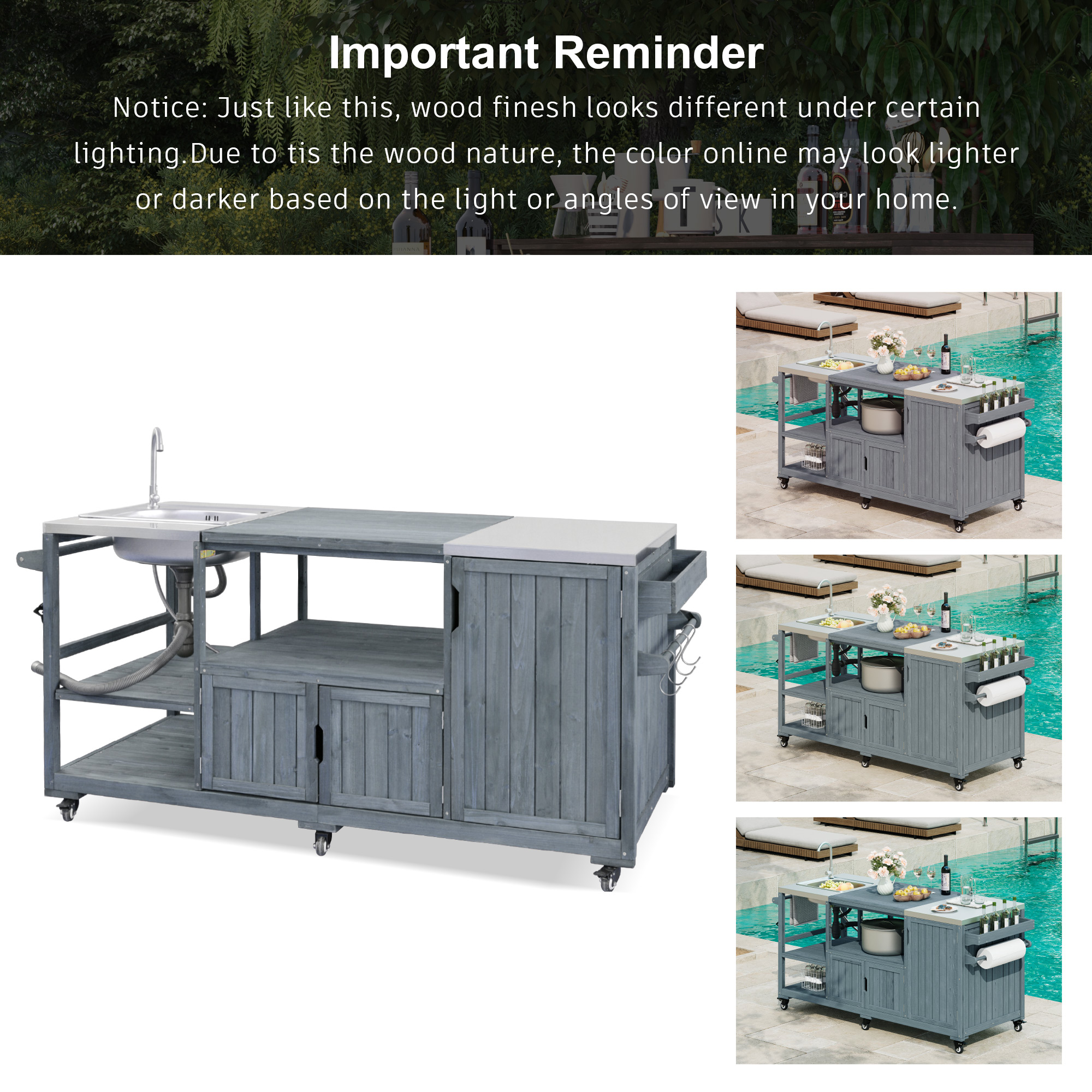 Product Name:K&K 75.4" Outdoor Kitchen Island with Sink, Solid Wood Outdoor Grill Cart for XL Green Egg Grills, Rolling Outdoor Bar Cart with Stainless Steel Top, for Pizza Prep & BBQ, Grey Blue