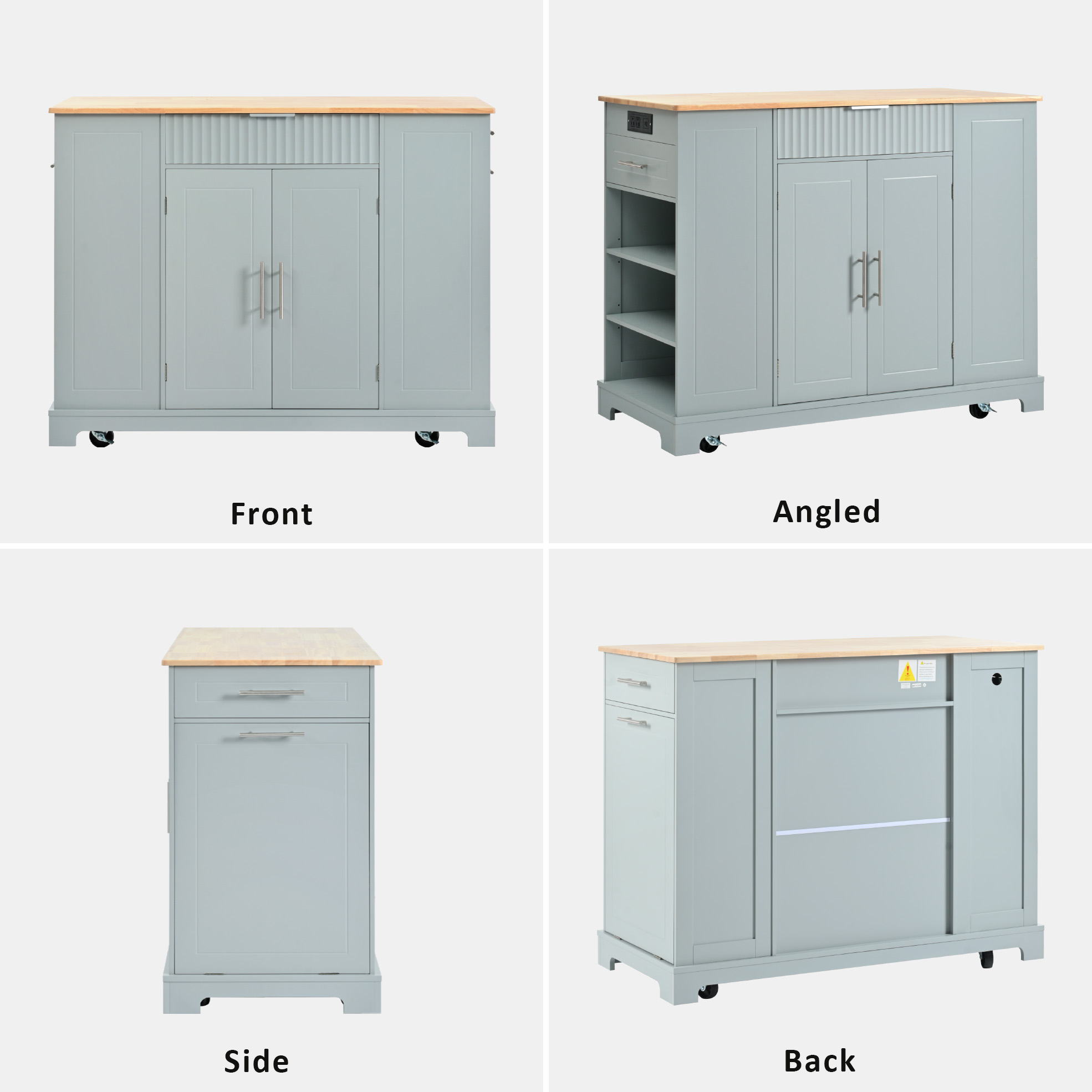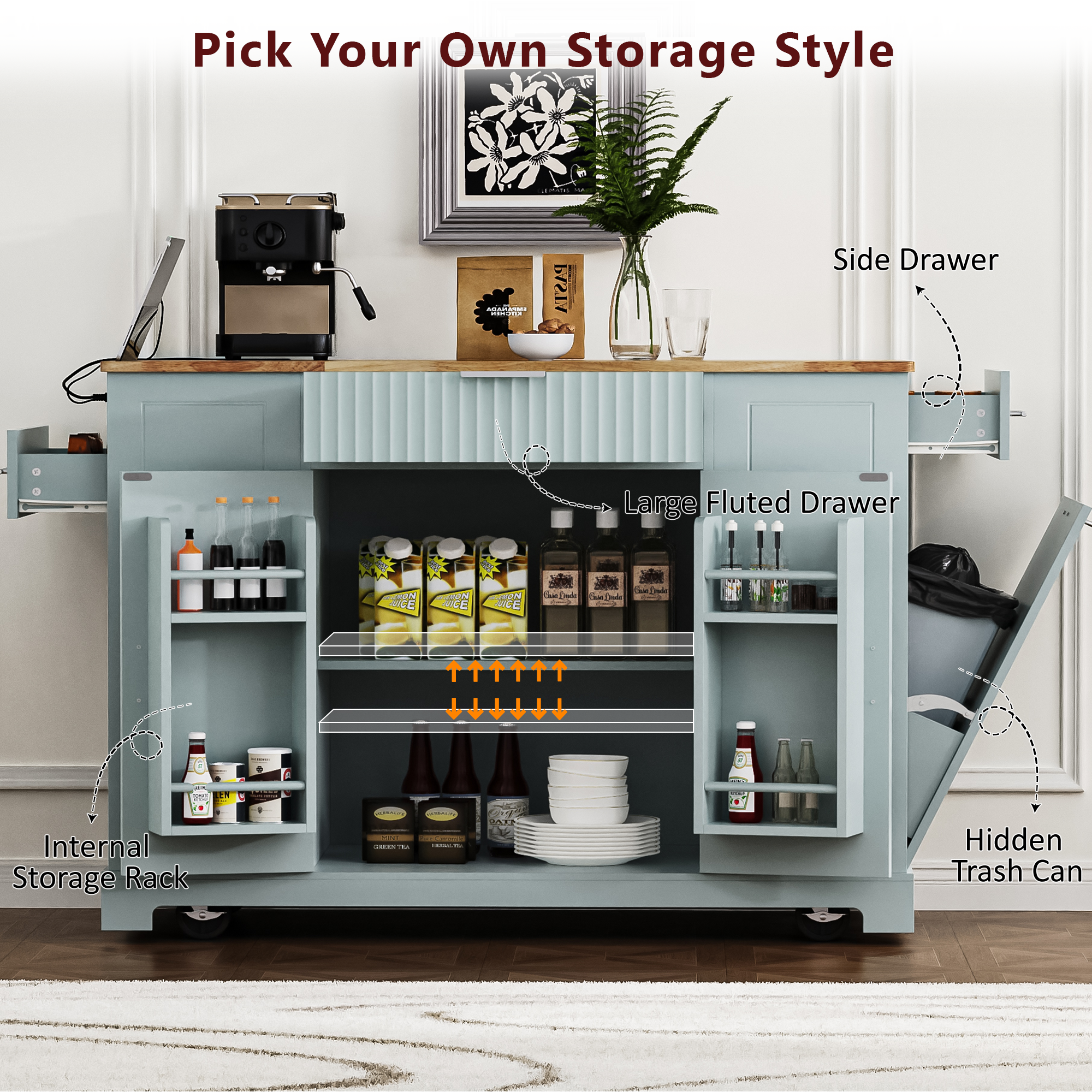 Home > K&K Fluted Kitchen Island With Trash Can Storage Cabinet, Power Outlet, Internal Storage Rack, Rolling Kitchen Islands On 5 Wheels With 3 Drawer,